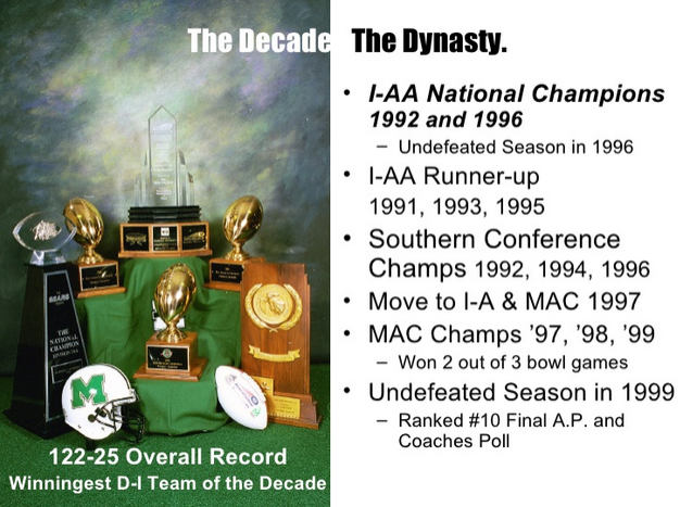 After I graduated from Marshall I continued to follow the team. Little by little they improved and that horrible team started winning and became the winningest team in the 1990s in any division of college football. The players that helped them become winners moved on to the NFL;