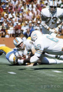 Hall of Famer David “Deacon” Jones, quarterback John Hadl and running back Mike Garrett. Charger fans hoped 1972 would see their team return to the positive side of the ledger. After losing their opener to the ’49ers, San Diego defeated Denver 37-14, tied the Raiders 17-17 and beat the Colts 23-20. Nobody expected an easy win for the Dolphins. But absolutely NO ONE could foresee the catastrophic injury that would impact Miami the day they played the Chargers in the historic Orange Bowl. Fourteen plays into the game, Bob Griese rolled out to his left, searching for an open receiver. Jim Kiick broke free as Griese’s pass headed downfield. Most eyes followed the ball. Behind the play, “Deacon” Jones and Ron East simultaneously crushed Griese. “I didn’t need to see the