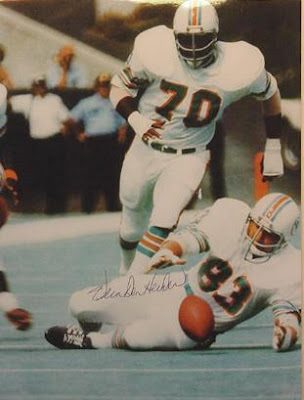 Shula was livid in the halftime locker room.  He told his team they were being outplayed by a 2-9 team.  And he told them there would be “no Perfect Season and no Super Bowl if we keep playing like this!”  On the third play of the third quarter the game changed drastically.  6-foot-6 Vern Den Herder intercepted a Plunkett pass and rumbled down the field.  “I’d never intercepted a pass in high school or college, so I kinda had to think,’What do I do now’?”  Den Herder showed surprising speed as he sprinted down to New England’s 11-yard line.  Three plays later, Morrall tossed a three yard TD pass to Jim Mandich and Miami was in clear control 20-7.  Miami’s next drive produced yet another Yepremian chip-shot field goal.  A few minutes, later, some tough running by Csonka paced a drive to the Pats’ 14.  From there, Morrall threw a 14-yard strike to Marlin Briscoe and the Dolphins were decisively ahead by a 30-7 margin after three quarters.