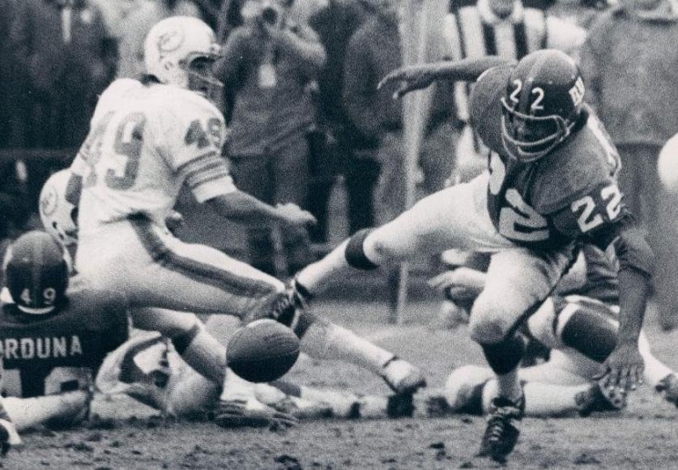 Continued steady rains turned an already messy field into a second half quagmire. Temperatures were in the 40’s and it was windy. The hard-hitting Dolphins’ defense, combined with very sloppy conditions, produced SIX GIANTS’ TURNOVERS! At the end of the third quarter, the score remained 17-13, Miami. Giants’ (and Jets’) fans knew that one big play could turn this game completely around. Emphasizing the run, Morrall drove Miami down the field in the final quarter. Some nice runs by Morris put Yepremian in position for a 31-yard field goal attempt in the slop. Garo’s kick was GOOD!! Miami had a 20-13 lead. New York’s sixth and final turnover set up Miami inside Giant’s territory. Yepremian’s chip-shot field goal CLINCHED a 23-13 victory for the wet, tired, but very happy Miami Dolphins! On the day, Miami rushed for 204 yards on 41 carries (a 5.0 average) and passed for 171 yards (132 of them to Warfield). The six turnovers produced by the “No Name Defense” were the key factor in holding the high-scoring Giants’ to just 13 points.
