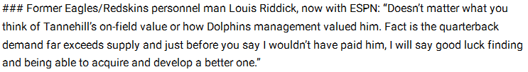 I posted this because it’s obvious he is going to be asked about the Dolphins and Tannehill in particular. I take all “reporters” with a grain of salt.