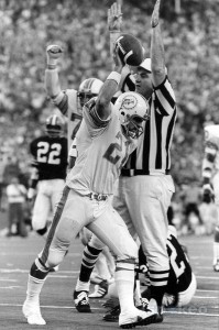 There was still time for a Browns’ miracle comeback.  With 1:15 to go, Cleveland was at the Miami 34 yard line.  Phipps spotted tight end Milt Morin down the field.  But Doug Swift stepped in front of Morin and registered the Dolphins’ FIFTH and most important interception of the game!  The “No Name Defense” had saved the day!  It was NOT a convincing win for Miami.  But the Dolphins had found a way to win.  And the 80,010 exhausted and happy fans who left the Orange Bowl that day could smile in the knowledge that “their boys” had gone 9-0 at home in 1972.  The Dolphins eventually would go on to win an NFL record 34 consecutive home games in the historic Orange Bowl by the end of the 1974 season.  It was a home field advantage unlike any other!