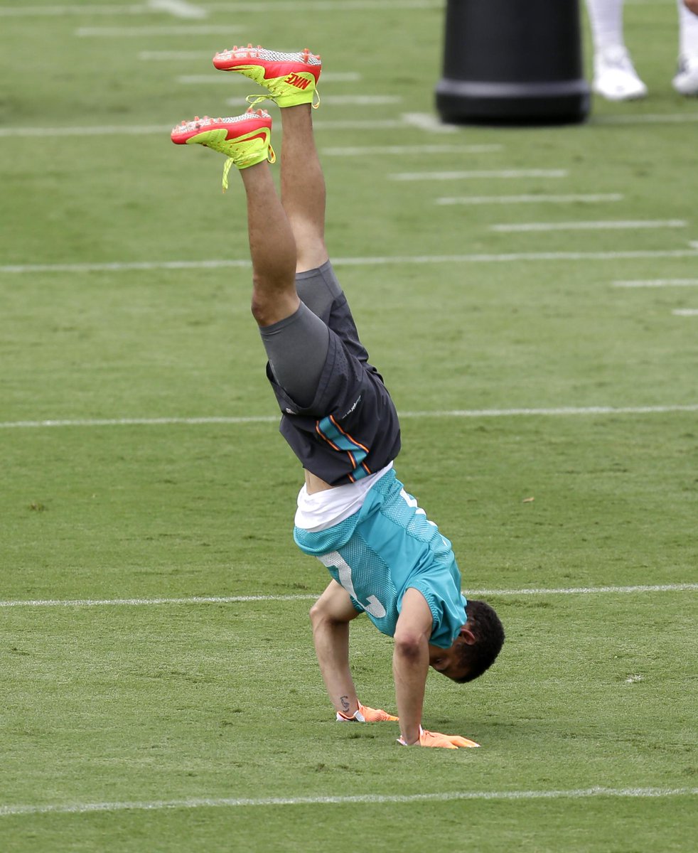 Miami Dolphins cornerback Brent Grimes does a handstand during an NFL organized team activities football practice, Tuesday, May 26, 2015, at the Dolphins training facility in Davie, Fla. (AP Photo/Wilfredo Lee)