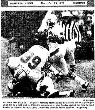 Again the Dolphins’ defense stopped the Patriots’ offense cold. White, under a ferocious rush, kicked the next punt STRAIGHT UP IN THE AIR! A backwards bounce left the ball at New England’s three yard line! Mercury Morris’ two yard touchdown run put Miami ahead 23-14 after three quarters.