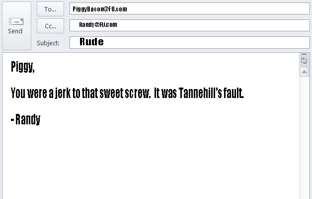 FOR WEEKS AFTER THE SHOW PIGGY RECEIVED HATE MAIL FROM PEOPLE WATCHING HIS MISTREATMENT OF THE SWEET SCREW. HERE IS A SAMPLING OF THE ANGRY EMAILS: