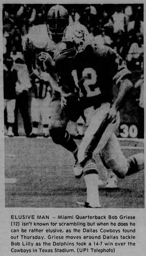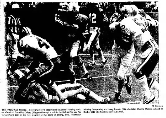 Miami’s “No-Name” defense stuffed Dallas on their second possession. Marv Bateman’s punt backed the Dolphins up to the Miami 32. From there, Mercury Morris sprinted for a 12 yard gain. Two plays later Griese went back to pass. No one was open, so Griese scrambled for 21 yards for a first down at the Dallas 45.