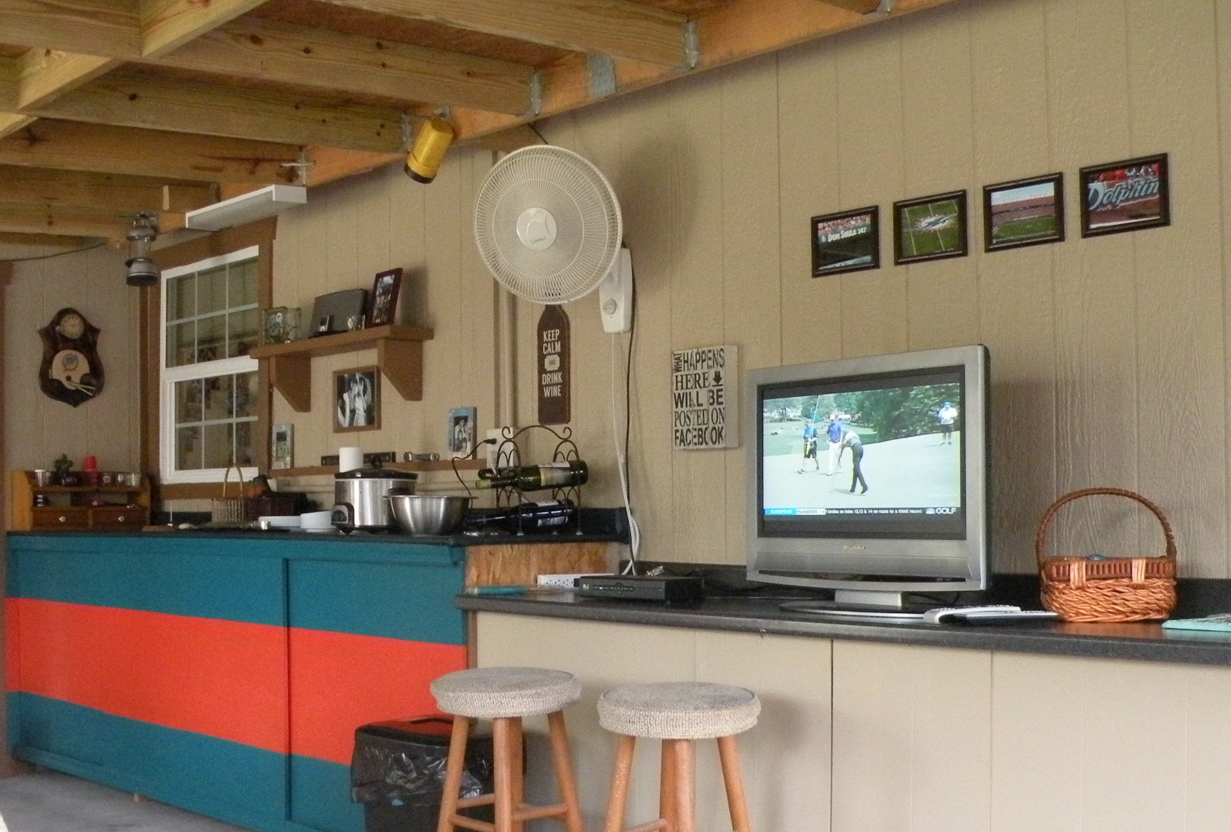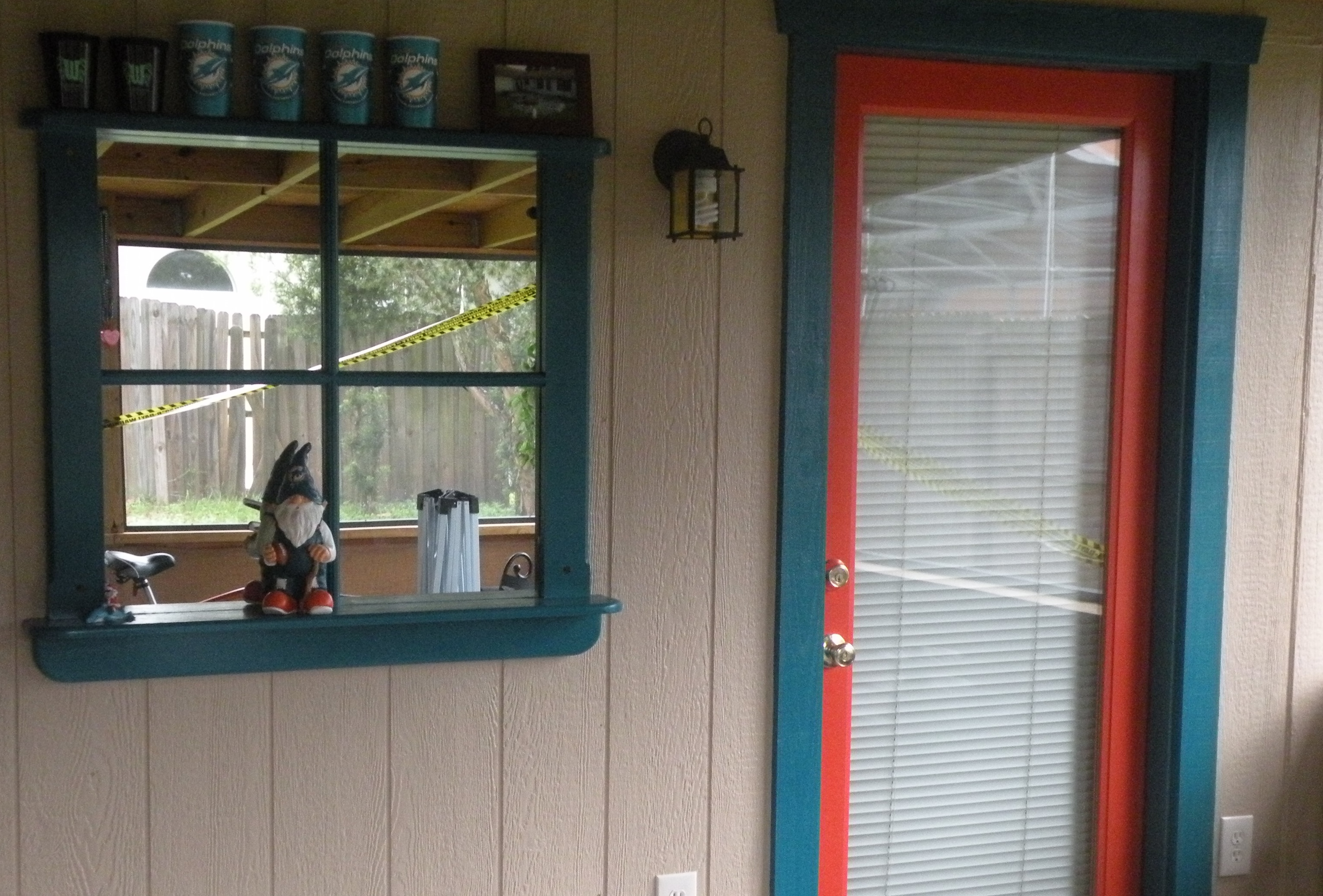With only one pre-season game left and another 11 days until gloriously the new season starts I thought I’d tell you about my Dolphin porch and what I want to do with it. We actually didn’t set out to make the porch a Dolphin porch,128 not sure why not actually, but it all came about as a result of re-purposing an old mirror that has a frame around it to make it look like a window. When we decided to use it my wife said, “hey let’s paint it teal”. So the Dolphin in me said, “well shit if we’re going to paint it teal we may as well use the official Dolphin color.” She agreed and I painted it on there and there was only one thing missing – Dolphin orange. Even though I didn’t put any orange on the mirror I did decide to paint a new wood framed door with it. And in my world painting wood is sacrilege; I could only ever paint wood with Dolphin colors otherwise no way. Anyway so here we are with a Dolphin porch and in need of more Dolphin stuff for the porch.