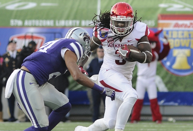 Jan 2, 2016; Memphis, TN, USA; Arkansas Razorbacks running back Alex Collins (3) carries the ball against Kansas State Wildcats defensive back Kendall Adams (21) during the first half at Liberty Bowl. Mandatory Credit: Justin Ford-USA TODAY Sports