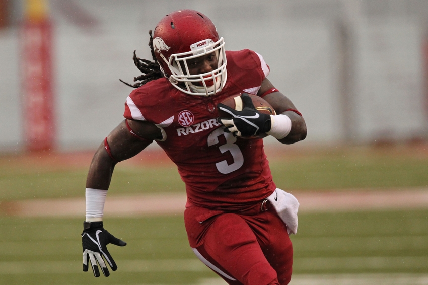 Nov 22, 2014; Fayetteville, AR, USA; Arkansas Razorbacks running back Alex Collins (3) rushes against the Ole Miss Rebels at Donald W. Reynolds Razorback Stadium. Arkansas defeated Mississippi 30-0. Mandatory Credit: Nelson Chenault-USA TODAY Sports