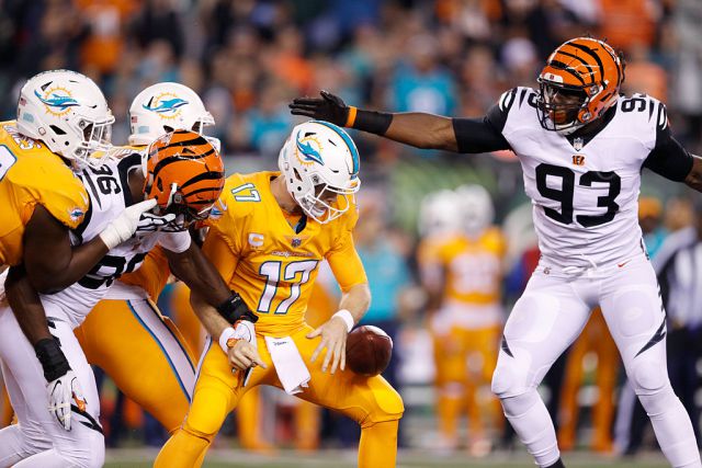 CINCINNATI, OH – SEPTEMBER 29: Carlos Dunlap #96 of the Cincinnati Bengals strips the ball away from Ryan Tannehill #17 of the Miami Dolphins during the game at Paul Brown Stadium on September 29, 2016 in Cincinnati, Ohio. The Bengals defeated the Dolphins 22-7. (Photo by Joe Robbins/Getty Images)