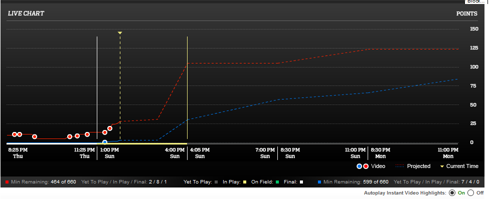 I’m cracking up at my FF graph. I have Blake Bortles who, even though he is an INT machine, isn’t usually a bad play because he throws it so much to make up for it. I guess I never had so many players going in the 1pm games to notice this but the spike on the chart has to be his 4th Q garbage time points. 😂😂😂