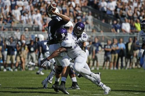 Penn State quarterback Christian Hackenberg (14) is hit by Northwestern linebacker Anthony Walker (18) as he releases the ball during the fourth quarter of an NCAA college football game in State College, Pa., Saturday, Sept. 27, 2014. The pass was incomplete. Northwestern won 29-6. (AP Photo/Gene J. Puskar)