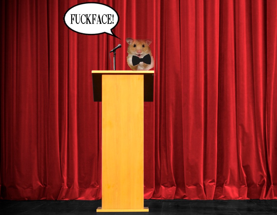 Rostrum with microphone and red curtain waiting for speech.