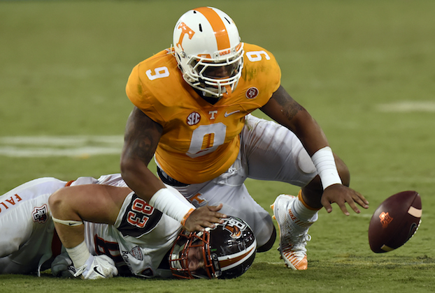 Tennessee defensive end Derek Barnett (9) breaks up a pass intended for Bowling Green tight end Derek Lee (83) in the second half of an NCAA college football game Saturday, Sept. 5, 2015, in Nashville, Tenn. Tennessee won 59-30. (AP Photo/Mark Zaleski)