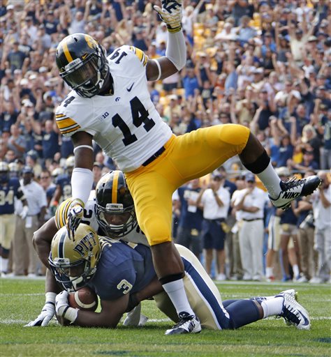 Pitt running back Chris James (3) scores a first-quarter touchdown as Iowa defensive back Maurice Fleming (28) makes the late tackle in the endzone, and Iowa defensive back Desmond King (14) leaps over them during an NCAA college football game in Pittsburgh, Saturday, Sept. 20, 2014. (AP Photo/Gene Puskar)