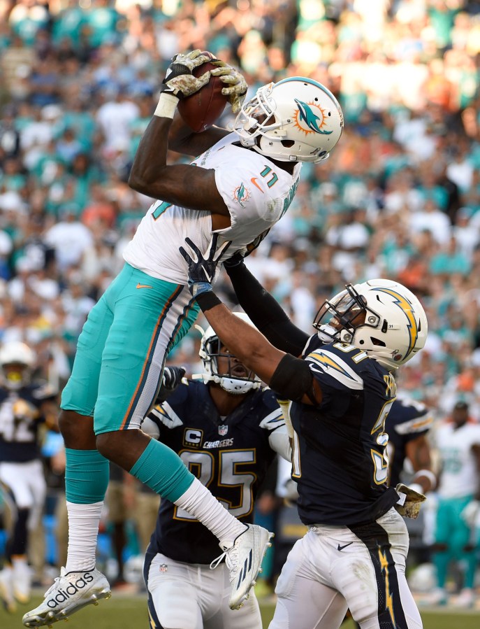 Miami Dolphins wide receiver DeVante Parker catches pass over San Diego Chargers strong safety Adrian Phillips during the second half of an NFL football game in San Diego, Sunday, Nov. 13, 2016. (AP Photo/Denis Poroy)