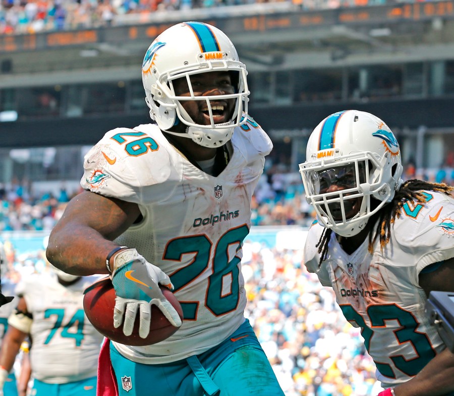 Miami Dolphins’ Damien Williams (28), celebrates with Jay Ajayi (23), after Williams scored a second quarter touchdown against the Pittsburgh Steelers on Sunday, Oct. 16, 2016 at Hard Rock Stadium in Miami Gardens, Fla. (Charles Trainor Jr./Miami Herald/TNS)
