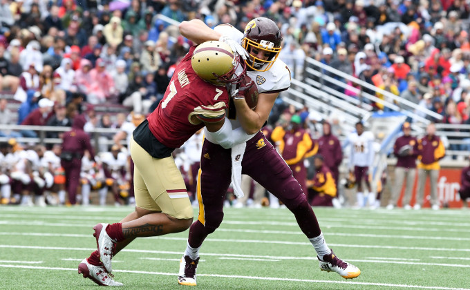 Sep 30, 2017; Chestnut Hill, MA, USA; Boston College Eagles defensive end Harold Landry (7) tackles Central Michigan Chippewas defensive back Alonzo McCoy (1) at Alumni Stadium. Mandatory Credit: Brian Fluharty-USA TODAY Sports