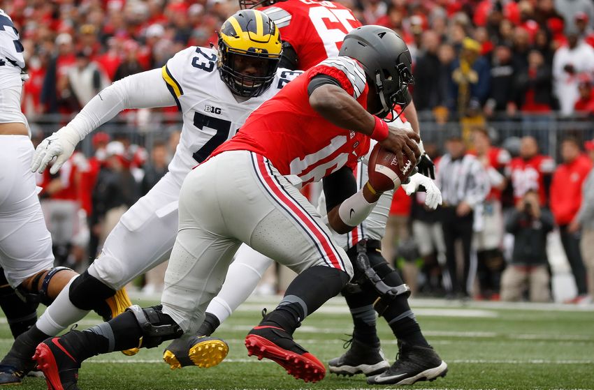COLUMBUS, OH – NOVEMBER 26: J.T. Barrett #16 of the Ohio State Buckeyes is pursued by Maurice Hurst #73 of the Michigan Wolverines during the first half of their game at Ohio Stadium on November 26, 2016 in Columbus, Ohio. (Photo by Gregory Shamus/Getty Images)