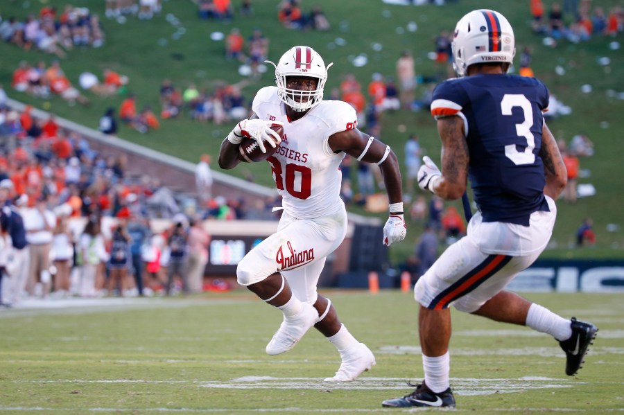Sep 9, 2017; Charlottesville, VA, USA; Indiana Hoosiers tight end Ian Thomas (80) carries the ball as Virginia Cavaliers safety Quin Blanding (3) defends during the second half at Scott Stadium. The Hoosiers won 34-17. Mandatory Credit: Amber Searls-USA TODAY Sports