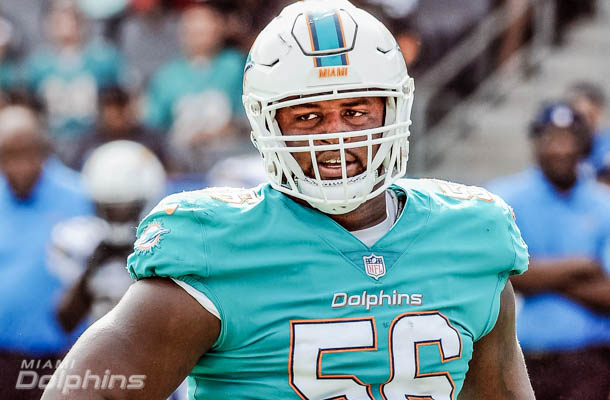 Miami Dolphins defensive tackle (56) Davon Godchaux on the field during the fourth quarter of an NFL game against the Los Angeles Chargers played at the StubHub Center in Carson, CA on Sunday, September 17, 2017. (AP Photo/John Cordes)
