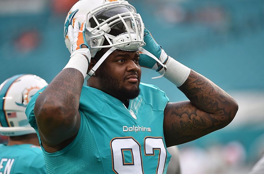 Sep 1, 2016; Miami Gardens, FL, USA; Miami Dolphins defensive tackle Jordan Phillips (97) slips on his helmet before a game against the Tennessee Titans at Hard Rock Stadium. Tennessee won 21-10. Mandatory Credit: Steve Mitchell-USA TODAY Sports