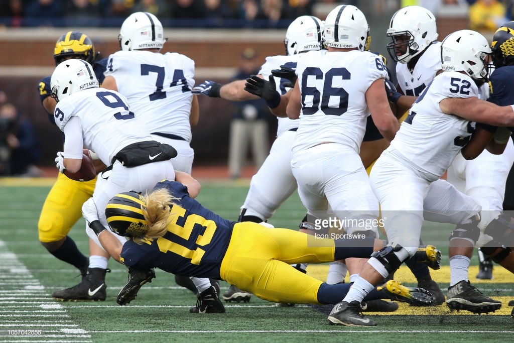 ANN ARBOR, MI – NOVEMBER 03: Michigan Wolverines defensive lineman Chase Winovich (15) sacks Penn State Nitty Lions quarterback Trace McSorley (9) during a game between the Penn State Nittany Lions (14) and the Michigan Wolverines (5) on November 3, 2018 at Michigan Stadium in Ann Arbor, Michigan. (Photo by Scott W. Grau/Icon Sportswire via Getty Images