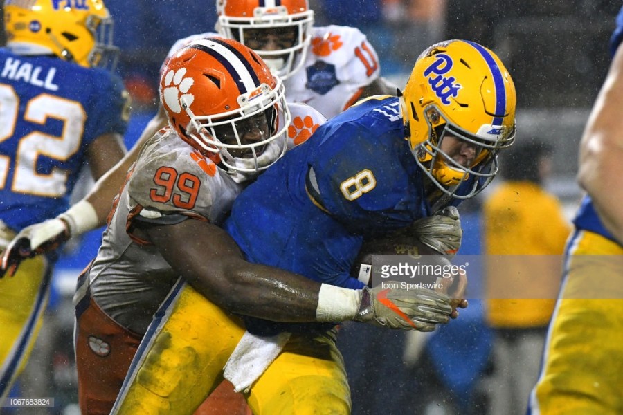 CHARLOTTE, NC – DECEMBER 01: Clemson Tigers defensive end Clelin Ferrell (99) gets the sack on Pittsburgh Panthers quarterback Kenny Pickett (8) in the ACC Championship game between the Pittsburgh Panthers and the Clemson Tigers on December 01,2018 at Bank of America Stadium in Charlotte,NC. (Photo by Dannie Walls/Icon Sportswire via Getty Images)