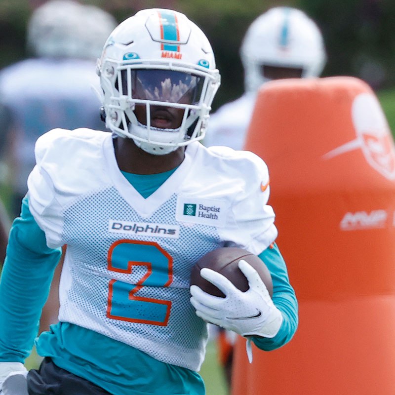 — Through the first set of team drill (when he had only one pass attempt) and that 6-on-9 passing period, Tua Tagovailoa was having himself a really good practice, but things went south a bit during that final, extended set of 11-on-11 plays. Tagovailoa ended up 5-for-9 in 11-on-11 drills with a long completion of about 45 yards to Tyreek Hill, though Hill had to slow down to catch the underthrown ball. Worse, there were two dropped interceptions against Tua, one by Brandon Jones and one by Nik Needham. On the Needham play, the cornerback was playing outside and undercut Preston Williams on a deep slant. Tua’s best pass came on a deep slant to rookie Braylon Sanders for about a 20-yard gain.