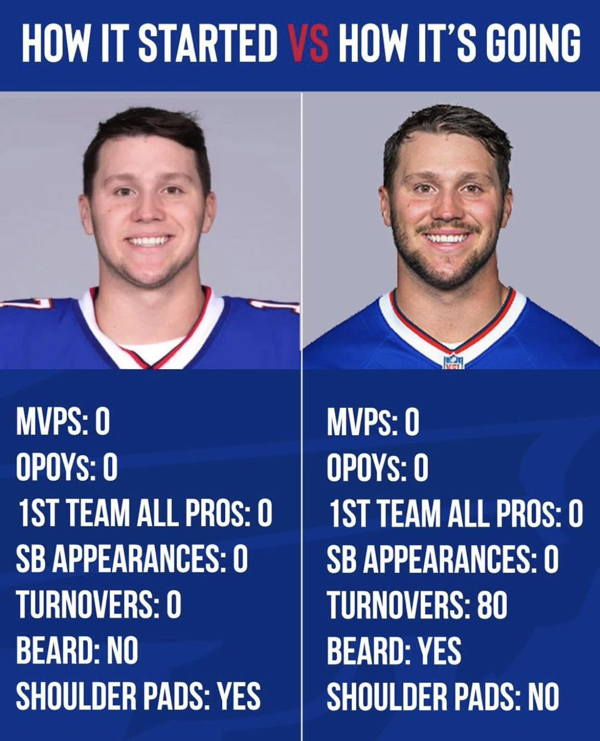 M – the offense goes as the QB goes. We all know this. In all those games against better teams, it wasn’t the running backs that failed, it wasn’t the WR’s, it’s the guy throwing to them. I can’t blame the defense because of all the injuries. It’s not that we lost, it’s that we’re not even competitive. Josh Allen wasn’t perfect, but damn that guy leaves it all out there on the field. Our QB disappears in games like these and I see that as a huge problem. It’s not 1 or 2 or 3, it’s 15. Non competitive, giving our team no chance. It’s not like we were losing 31-28, we don’t score, don’t compete. If you think that it’s going to change, I’d like to hear how and why.