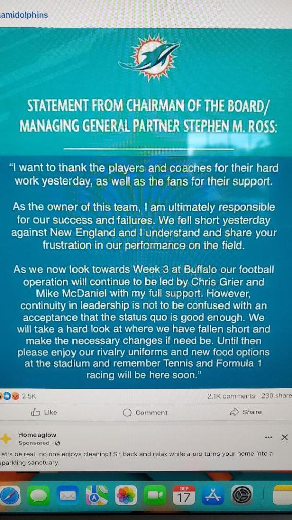 The team held a players own meeting after the poor showing Week 1. What exactly that means is unclear, but it’s Week 2 and you’re excluding the HC from a meeting? Not necessarily a good look from any perspective. What have y’all been doing up until this point? QB Tua Tagovailoa has been ornery answering questions and seems angry with some of the reporters questions. Answer those questions on the field young man, stop whining, bitching about what reporters said after you shit the bed on opening day! You don’t appreciate the negativity, play as well as your undying supporters think you’re capable of, like some Top 5 God of a QB! It will undoubtedly make the post game interviews much more palatable.
