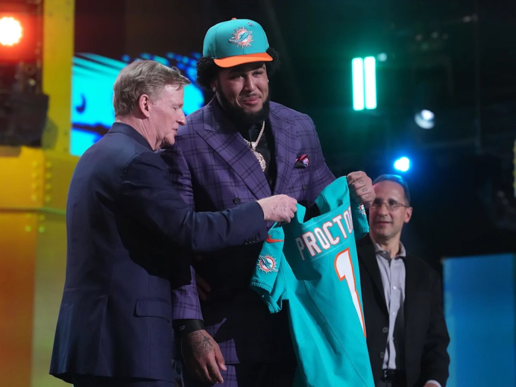 Dolphins: We are going to build from the inside out. Dolphins: Speed gets slow. Big doesn’t change. Dolphins: With the 12th pick, we select Kadyn Proctor, T, Alabama. Fans: WHAT?!?!?!?!?!?!?!?!?!?!?!?!?!?!?!?!?!?!?!?