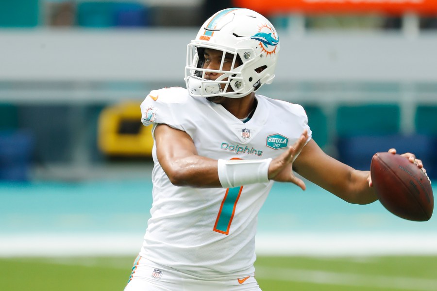 MIAMI GARDENS, FLORIDA – SEPTEMBER 20: Tua Tagovailoa #1 of the Miami Dolphins warms up prior to the game against the Buffalo Bills at Hard Rock Stadium on September 20, 2020 in Miami Gardens, Florida. (Photo by Michael Reaves/Getty Images)