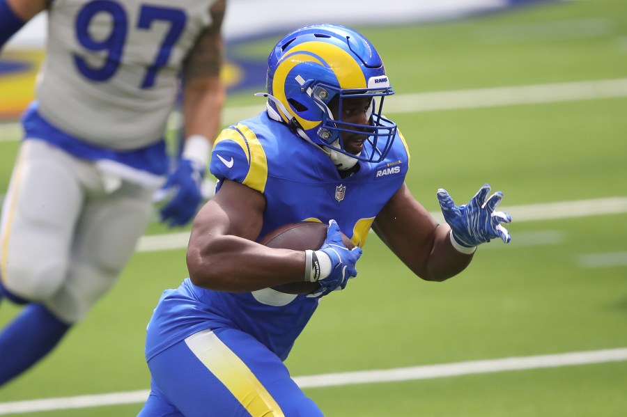 INGLEWOOD, CALIFORNIA – AUGUST 29: Malcolm Brown #34 of the Los Angeles Rams rushes during a team scrimmage at SoFi Stadium on August 29, 2020 in Inglewood, California. (Photo by Sean M. Haffey/Getty Images)