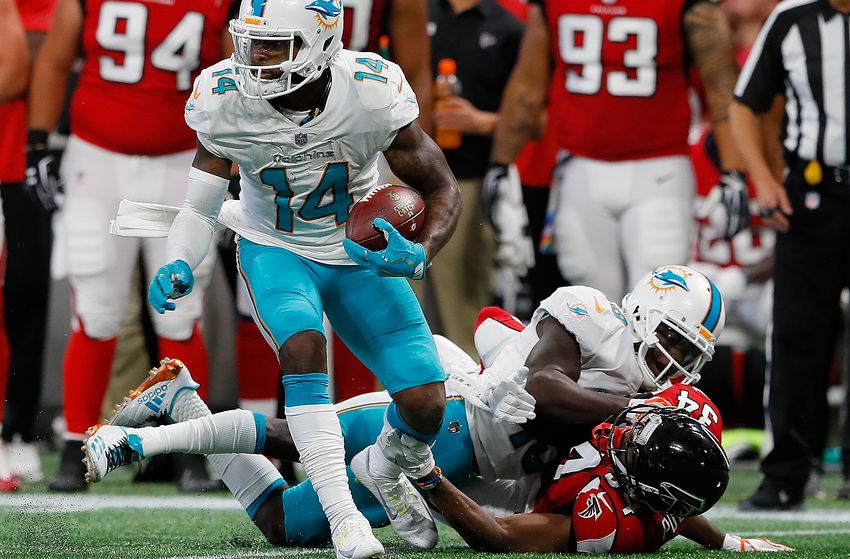 ATLANTA, GA – OCTOBER 15: Jarvis Landry #14 of the Miami Dolphins attempts to break a tackle by Brian Poole #34 of the Atlanta Falcons at Mercedes-Benz Stadium on October 15, 2017 in Atlanta, Georgia. (Photo by Kevin C. Cox/Getty Images)