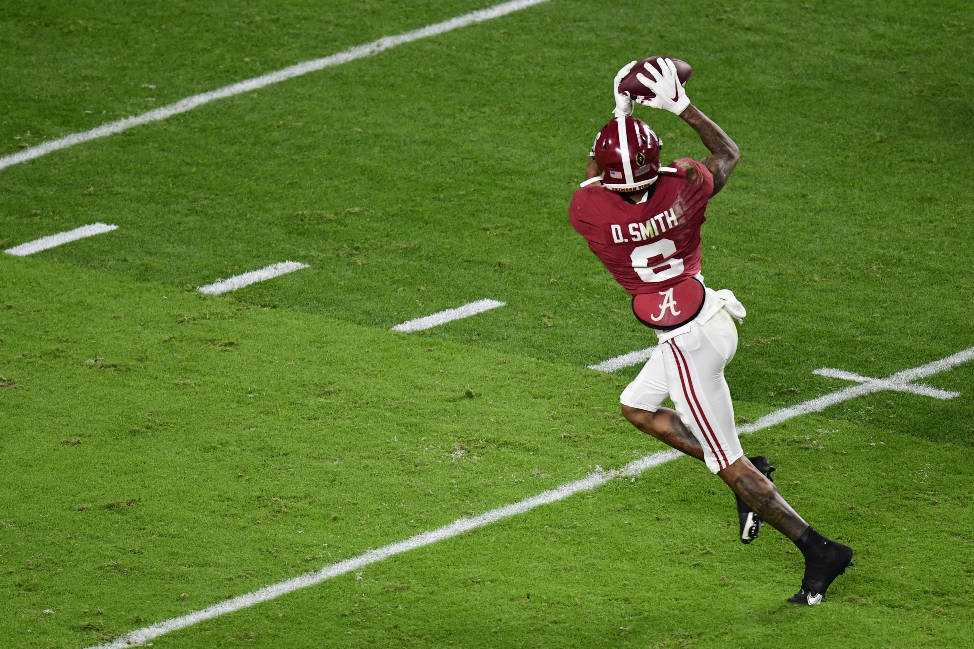 Jan 11, 2021; Miami Gardens, FL, USA; Alabama Crimson Tide wide receiver DeVonta Smith (6) catches a pass against the Ohio State Buckeyes for a touchdown in the second quarter in the 2021 College Football Playoff National Championship Game at Hard Rock Stadium. Mandatory Credit: Douglas DeFelice-USA TODAY Sports