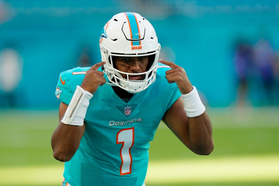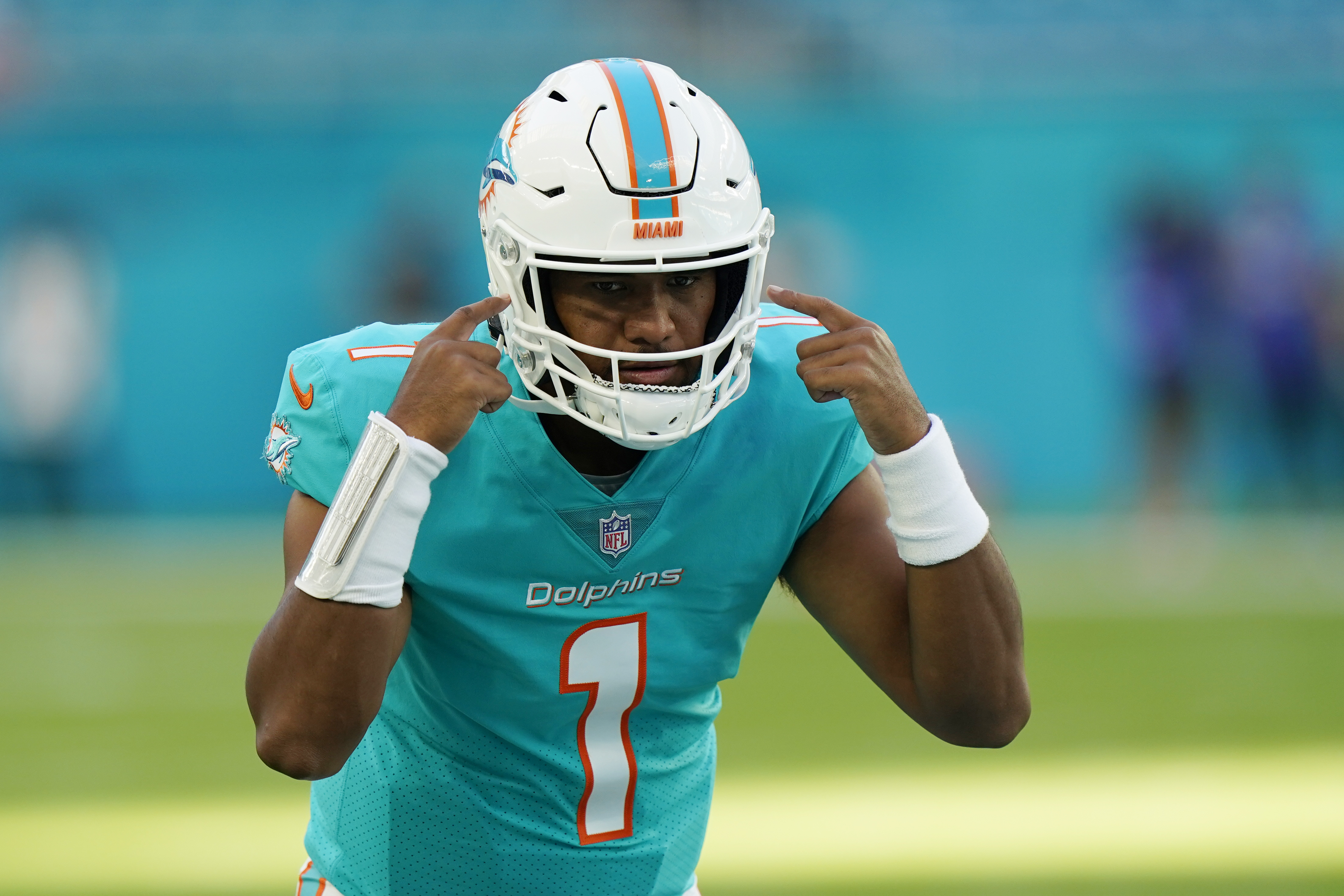 Miami Dolphins quarterback Tua Tagovailoa (1) warms up before a NFL preseason football game against the Atlanta Falcons, Saturday, Aug. 21, 2021, in Miami Gardens, Fla. (AP Photo/Wilfredo Lee)